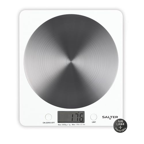 Salter vit skiva digital köksvåg – elektronisk matvåg, lägg till och väga flera ingredienser, 5 kg kapacitet, Aquatronic för mätvätskor, lättläst LCD-skärm, inkluderar batteri