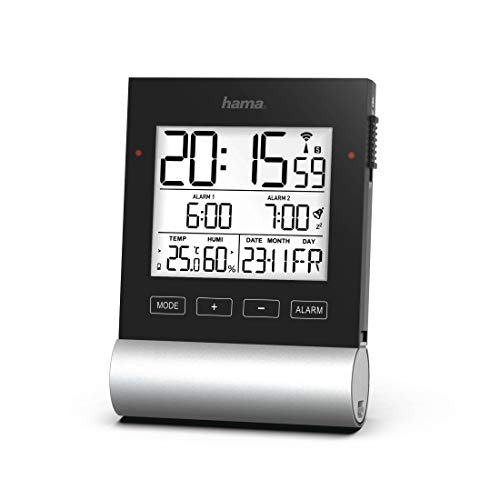 Hama Digital radioväckarklocka "Black Line" (digital väckarklocka med hastighetslarm, 2 larmtider och snooze-funktion, display för datum, inomhustemperatur och luftfuktighet, inkl. batterier) svart