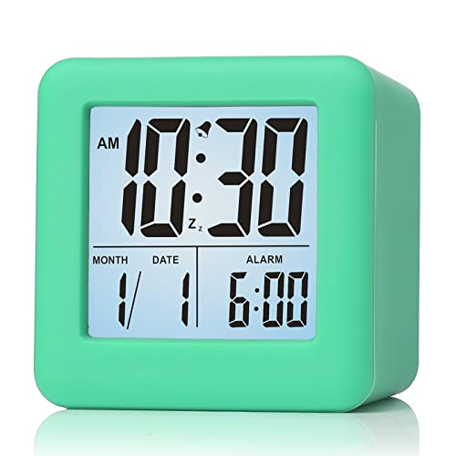 Plumeet Enkel inställning Digital väckarklocka med snooze, mjukt nattljus, stor visningstid & månad & datum & larm, stigande ljudlarm och handhållen storlek, bästa gåva för barn (grön)