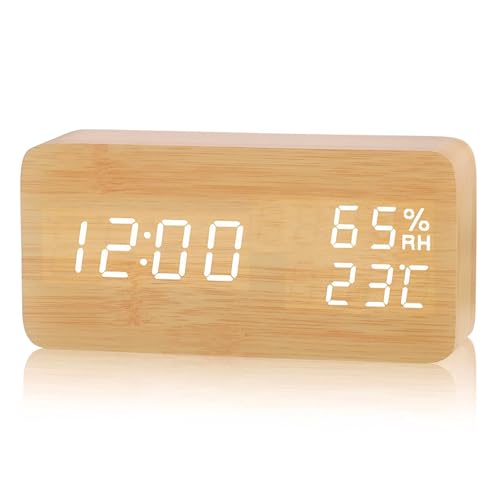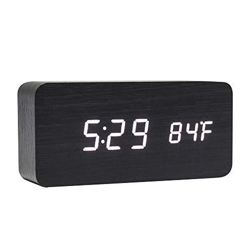 Lancoon Digital träklocka - multifunktionell LED-väckarklocka med tid/datum/temperaturvisning och röststyrning för hemresor - AC11Black_White