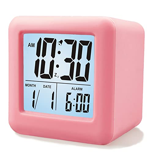 Plumeet Digital väckarklocka för barn med snooze och nattlampa – enkel inställning, visningstid i silikon, datum – högt för sovrum – batteridriven (babyrosa)