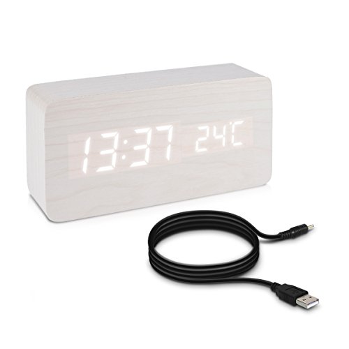 Kwmobile väckarklocka, klocka i träutseende, digital - digital väckarklocka, visning av tid, temperatur, datum, - larmklocka med USB-kabel i vitt med vita lysdioder