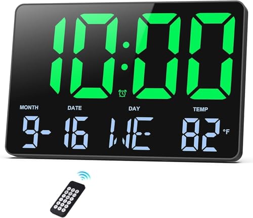 Digital väckarklocka stor display, 11,5 tum LED digitalklocka med fjärrkontroll, väggklocka digital med tid, datum, vecka, temperatur, snooze, justerbar ljusstyrka, 12/24 timmars väggklocka för