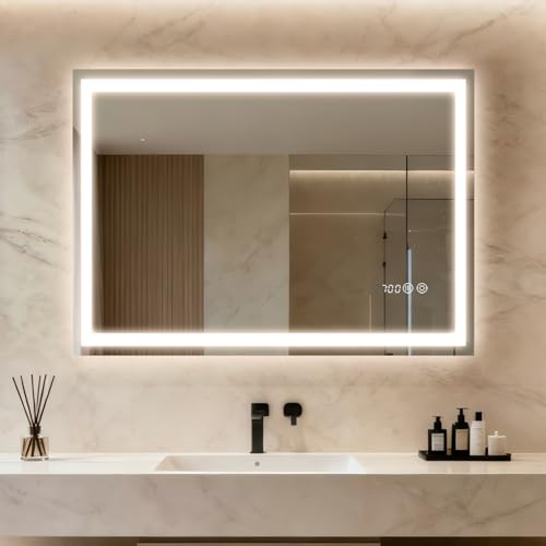 Clevich Badrumsspegel med belysning och klocka 100 × 60 cm, LED-spegel med 3 ljusfärger dimbar, härdat glas och digitalklocka, pekbrytare, minnesfunktion, dimfri, badrumsspegel med ljus