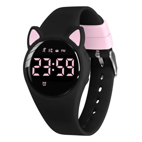 aswan watch digitalklocka, barn, flickor, pojkar, med stegräknare, väckarklocka, stoppur, ljus, datum, sportarmbandsur utan app och mobiltelefon med silikonarmband, 44 svart rosa kattöra, Armband