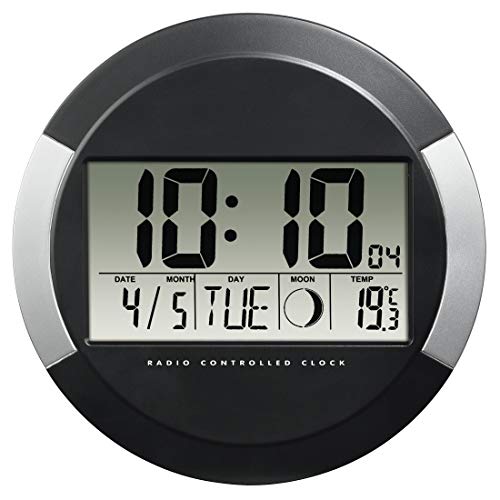 Hama Digital väggklocka med temperaturdisplay, "PP-245" (DCF radioklocka med datum, termometer, månfas, för att ställa upp/upphängning, 17 cm diameter, rund) digitalklocka, basklocka silver/svart