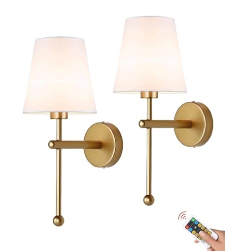 HOTUT 2-pack batteridriven vägglampa, dimbar RGB-vägglampa med avtagbara lampor och fjärrkontroll, gyllene uppladdningsbar, trådlös vägglampa med vit skugga, för sovrum, vardagsrum, korridor