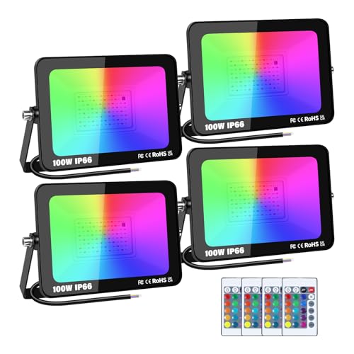 PICAA Utomhus säkerhet LED-projektor, 100 W RGB färgskiftande med IP66 vattentät, dimbar fjärrkontroll, vägglampa för trädgårdsfest scen (4 paket)