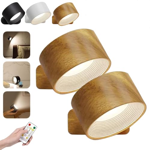 Lights of Sweden Vägglampor, med fjärrkontroll, uppladdningsbar 3 färgtemperaturer Dimbar vägglampa 360° Rotation Trådlös ljus for sovrum i vardagsrummet.(Wooden*2)