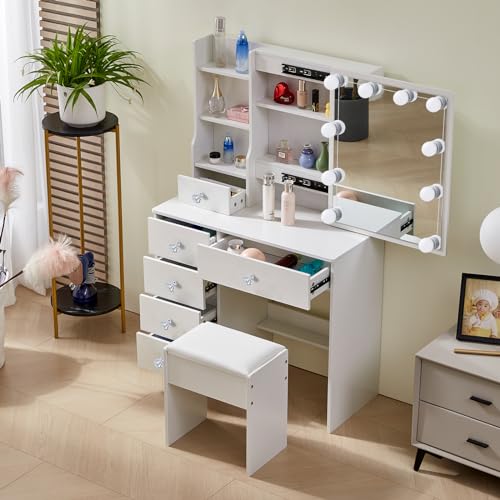 Teousev Sminkbord med Dimbara Lampor, Sminkbord med Spegel och Pall, Kosmetikbord med 6 Lådor och 6 Öppna Hyllor, Modernt Sminkbord för Sovrum, Vit, 80X36X131cm, JR395