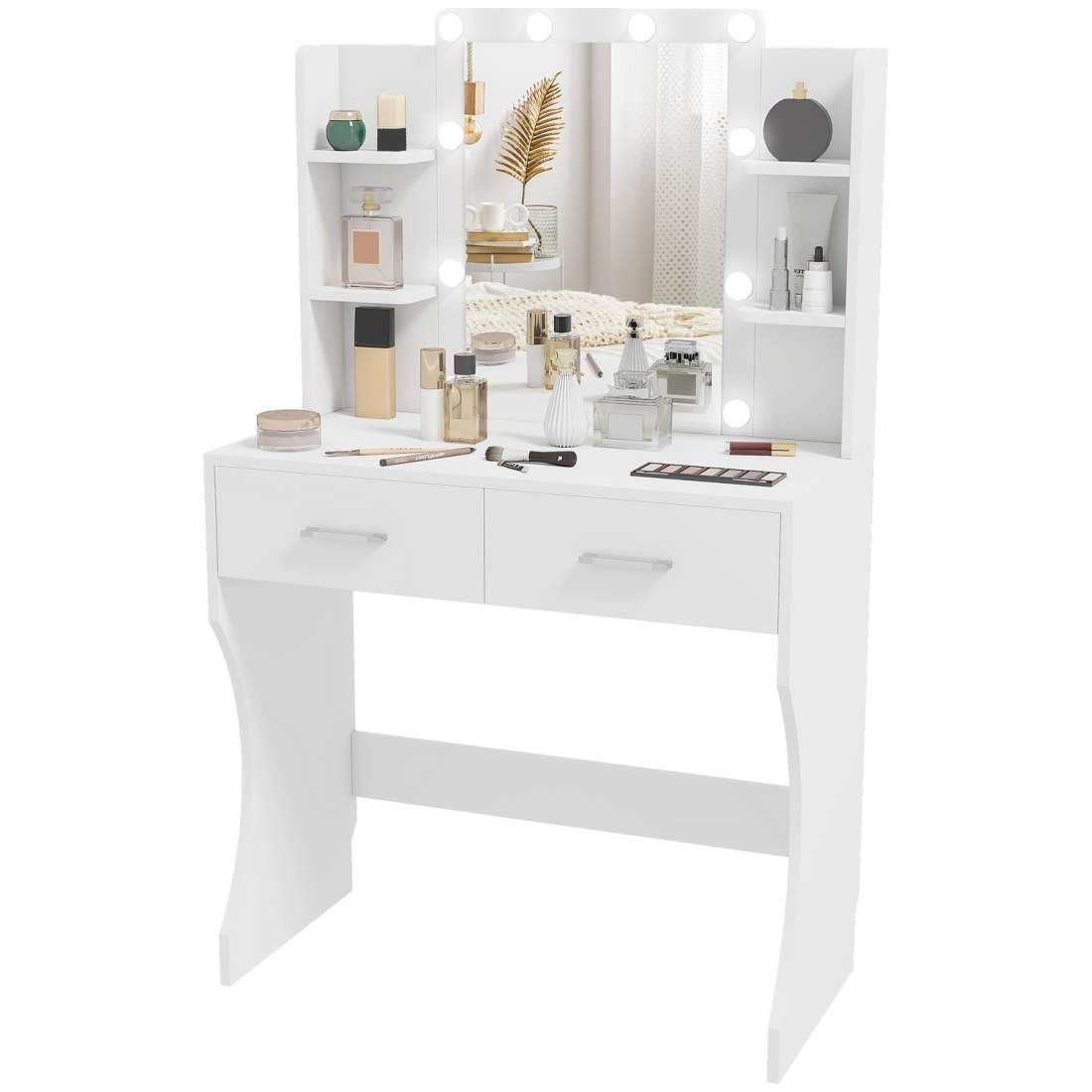 Sminkbord med spegel och dimbara LED-lampor, lådor, hyllor, vit