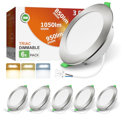 ALUSSO Infälld LED Spotlights Dimbara 10W 1050LM 3CCT Varmvit 3000K Neutralvit 4000K Kallvit 6500K Justerbar IP44 Badrumsspotlights, Utskärning 90-100mm, Borstad Nickel, 6 Pack