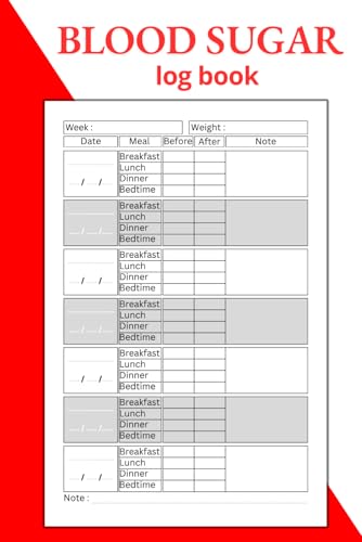 Diabetes Journal Log Book: Simple Red Cover Glucose Tracking Record. Flexible Daily Monitoring for Breakfast, Lunch, Dinner, and Bedtime with Weekly ... Years of Use. For Type 1 and Type 2 Diabetics