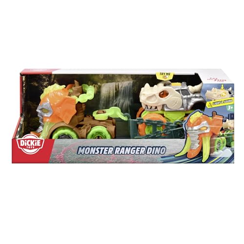Dickie Toys 203755005 - Monster Ranger Dinosaurie, Bil med Släp - Dickie Toys Monster Ranger med ljus, Hytt format som Mammuthuvud, Från 3 år