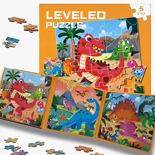 FUNTECH 3-i-1 magnetiskt dinosauriepussel, 3 år gammalt pussel - 6 år, Montessori-spel 3 år+ pedagogisk leksak med 97 stycken, dinosaurie-magnetibook, spel för barn 4 år, originalgåva