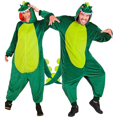 W WIDMANN MILANO Party Fashion Dinosauriedräkt för vuxna, grön plyschdräkt med huva, karneval djurdräkt