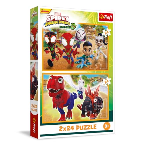 Trefl - Pussel 2-i-1: Marvel, Spidey and his Amazing Friends, Spidey och dinosaurier - 2 x 24 bitar, Set med två pussel för barn från 3 år