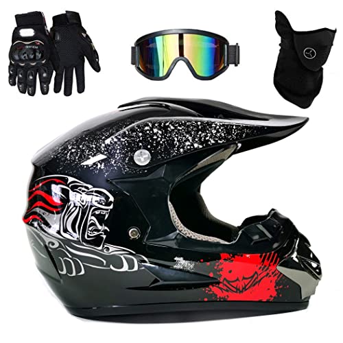 UIGJIOG Svart tryck Barn Dirt Bike Hjälm, Full Face Motorcykelhjälmar för Barn Mountain Bike Hjälm Full Face med skyddsglasögon Hjälm Set Inklusive 4 Storlek Tillbehör,Black