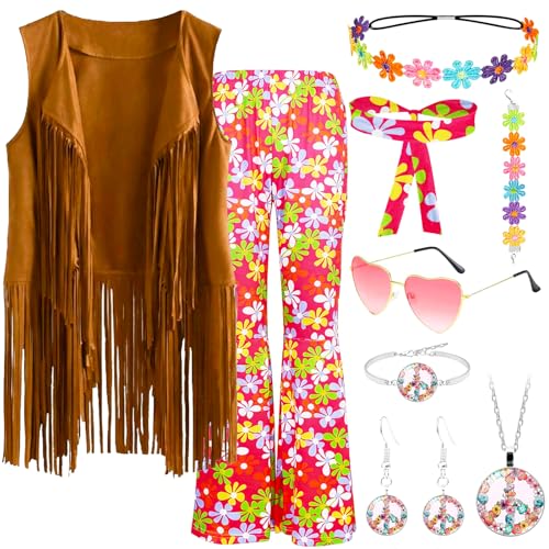 9 stycken hippie-dräktsset för kvinnor, 70-tals kvinnor hippie-kläder med fransväst, slagbyxor, pannband, solglasögon, halsband, örhängen för karneval karneval disco temafest (XL)