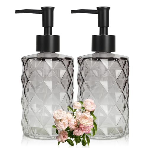 Ulable Glass Soap Dispenser with Plastic Pump, 2 Pack 12oz Gradient Diamond Design Black Soap Dispenser for Dishwashing Liquid, Lotion Shower Gel