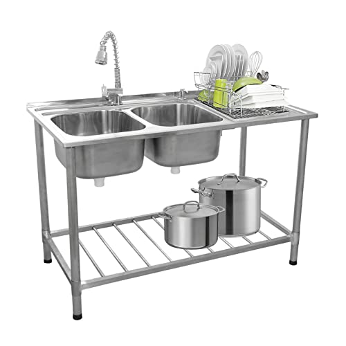 HuKaiL fristående rostfritt stål diskbänk, diskbänk med diskbänk och 360° armatur, kommersiell diskbänk komplett handfat kallt och varmt med 100 kg lastkapacitet kök, tvätt, garage, 120 x 45 x 80 cm