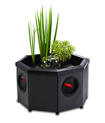 Aquagarden, affinitet, komplett diskbänk med fönster – åttkantig, pool med vattenspel, inklusive Inpond 5 i 1 2000 damm- och vattenpump med UV-klarare, tre fönster