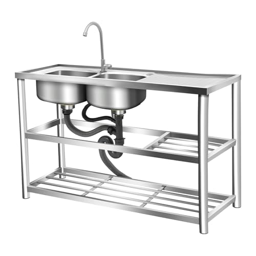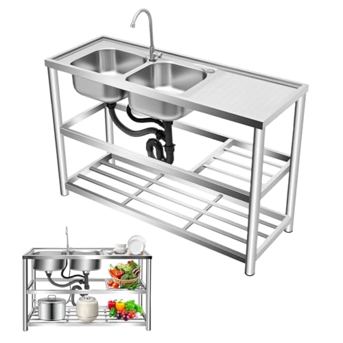 BJTDLLX Diskbänk i rostfritt stål med underskåp, dubbelhandfat deluxe diskbänk, 120 x 45 x 80 cm fristående diskbänk kommersiell med dräneringsenhet och vattenkran, komplett set