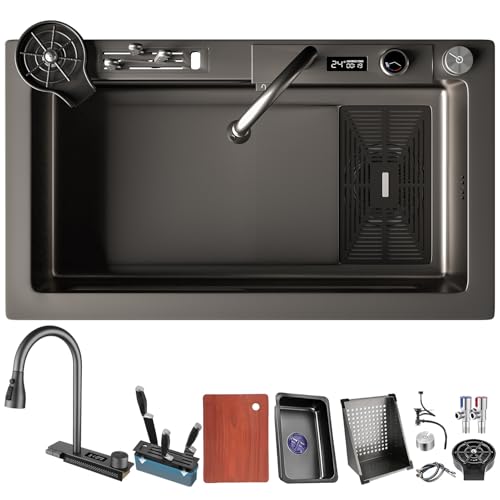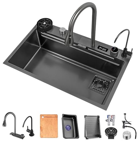 Svart Diskbänk Vattenfallsvask I Rostfritt Stål Diskbänk För Arbetsstation Med En Skål Med Multifunktionell Digital Display Utdragbar Kran (Color : Black, S : 68x46x22cm)