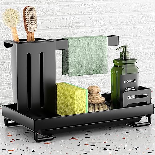 BRYN Svamphållare för diskbänk, kolstål, svamphållare, diskbänkshållare med handdukshållare, organiserare för diskbänk, badrum (svart)