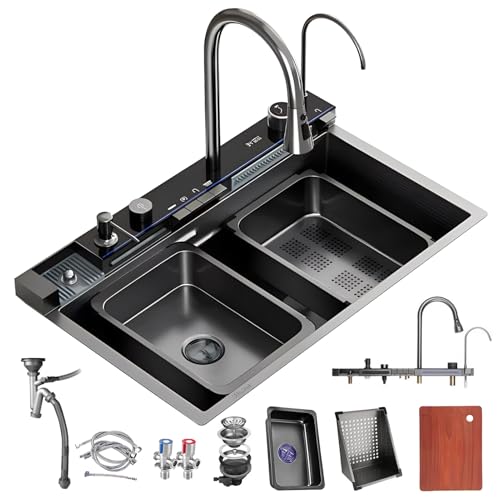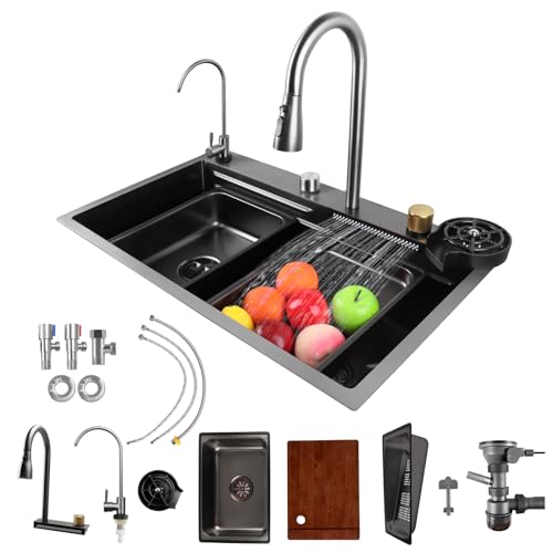 Fulgutonit Diskbänk med Vattenfall, Multifunktionell Diskbänk med Vattenfallskran, Diskbänk Svart Rostfritt Stål Handfat med Utdragbara Kranar Glastvättmaskin Kompletta Tillbehör (75x46cm)