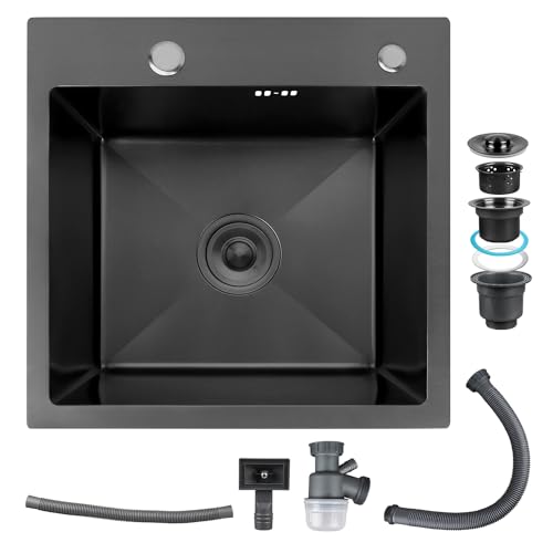 Diskbänk, svart 40 x 45 cm, rostfritt stål, enkel diskbänk, inbyggd montering, inkl. blandare, tvåldispenser, avlopp och droppbricka