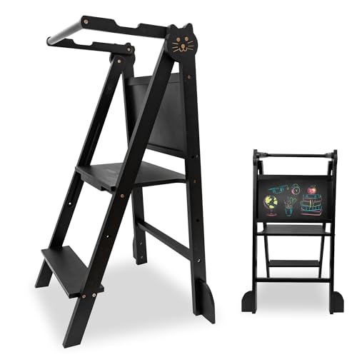 Oemmie Lärningstorn – Hopfällbar Montessori Stegpall med Krittavla – Kökshjälp för Barn – Stabil Barnpall för Diskbänk & Handfat – Svart