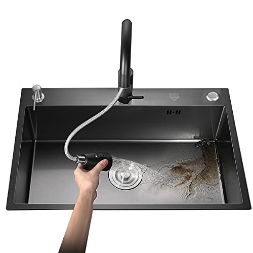 DSMRLEOP Svart diskbänk i rostfritt stål, handfat för vattenfall, multifunktionell diskbänk för arbetsstation med en skål, toppmonterad nanobeläggning med diskbänk med utdragbar kran, sifon, bräddavlo