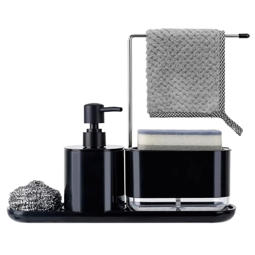 Kook Time Diskbänksarrangör och diskmedelsdispenser, köksset, tvåldispenser med svamphållare och diskborsthållare, perfekt för diskbänk – svart – 21 x 12 x 19 cm.