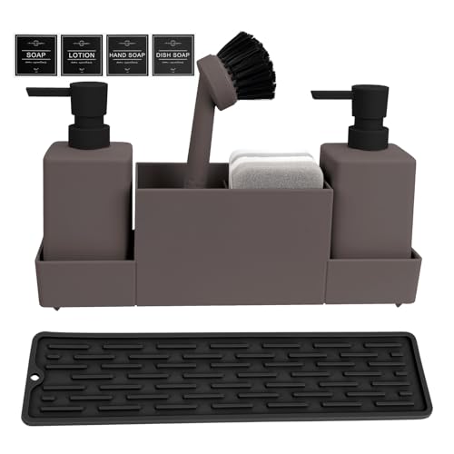CAUTIOUS Diskbänksförvaring 350 ml med borste, tvåldispenser disksvamp, köksdiskmedelsdispenserset av plast, diskorganiserare med två tvåldispenser, arrangör för köksprylar (brun)