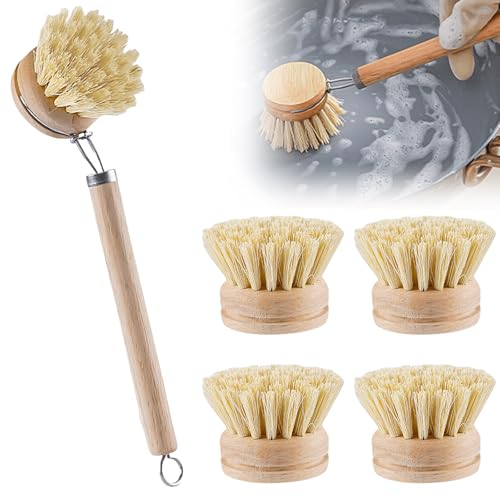 Trä tvättborste med utbytbart huvud, diskborste köksborste i set om 4, köksborste naturfiber, tvättborste 3 x reservhuvuden, naturfiberborste utbytbart huvud