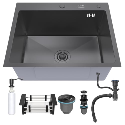 ANW HOME Graphite Diskho 60 x 50 cm med Sifon, Korgdränering och 350 ml Tvåldispenser, 304 Rostfritt Stål Diskho med 2 Kranhål