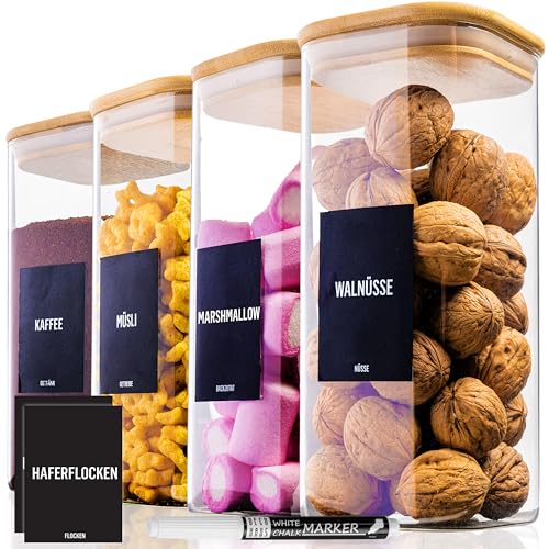 Deco haus® Återanvändningsbara Förvaringsburkar - Glasburkar med Lock - Set om 4 1400ml - Lufttäta, för Diskmaskin, Mikrovågsugn - Teburkar, Kakburkar, Kryddburkar osv. - 4x 20 cm Höjd, 10 cm Ø