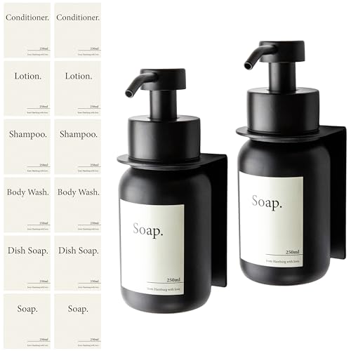 Designfabrik Hamburg Tvålpump i glas med självhäftande väggfäste, dubbelpack, i rostfritt stål, för flytande tvål, diskmedelspump som monteras utan borrning, 2 x 250 ml (svart/svart)