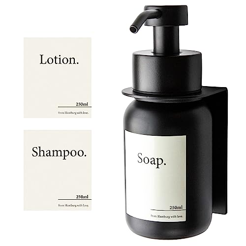 Designfabrik Hamburg Tvålpump i glas med självhäftande väggfäste, tvåldispenser i rostfritt stål för flytande tvål, diskmedelspump som monteras utan borrning, 250 ml (svart/svart)