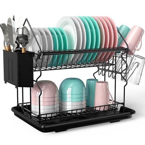 Diskställ med 2 nivåer med droppbricka, svart rostfritt stål disktorkställ köksbestick dränering för diskbänk, med dräneringsbräda och diskställ, tallriksarrangör för köksskåp