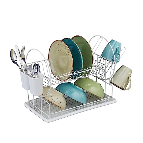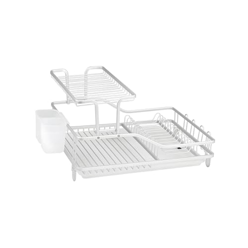 Navaris diskställ med 2 nivåer – kompakt torkande köksbräda med droppbricka och bestickhållare – lätt att montera och rengöra rätter – diskbänksställ – vit