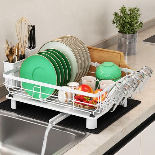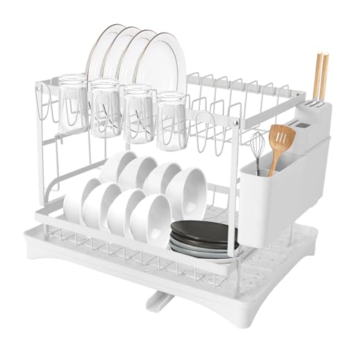 Boosiny Diskställ i rostfritt stål, torkställ med dropplatta, svängbar dräneringspip, redskapshållare, mugghållare och torkmatta, vit