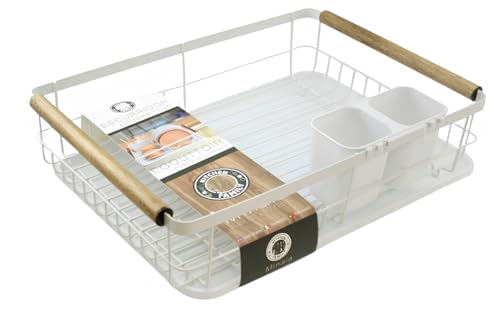 Amig - Graz Diskställ - 42 x 31,5 x 15 cm - Stål med trähandtag - Vit - Diskställ med droppbricka och bestickhållare - Kapacitet 10 tallrikar och 6 glas - Modern design