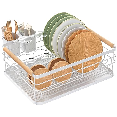 JOUING Diskställ porslin droppställ med bestickhållare diskställ med droppskål metall diskkorg för diskbänk droppställ med redskapshållare(Vit, Stor)