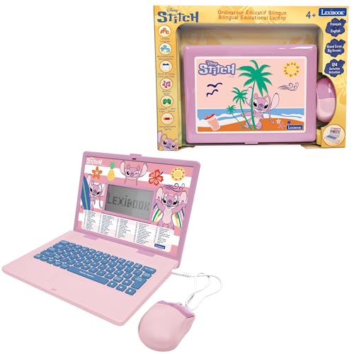 Lexibook, Disney Angel - Stitch, fransk-engelsk tvåspråkig pedagogisk bärbar dator, 124 pedagogiska aktiviteter, stor skärm 5,1 x 9,7 cm, realistiskt tangentbord och mus, tunn design, JC598D1i1