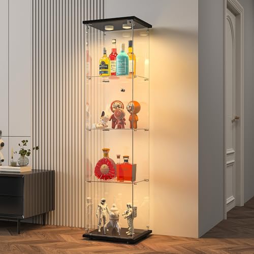BPKADHY glasvitrinskåp, 4 lager vitrinskåp, 1 dörrar, LED-lampa och lås med spegelbaksida glasvitrinskåp, stående vardagsrumsskåp för samlarobjekt och böcker, svart