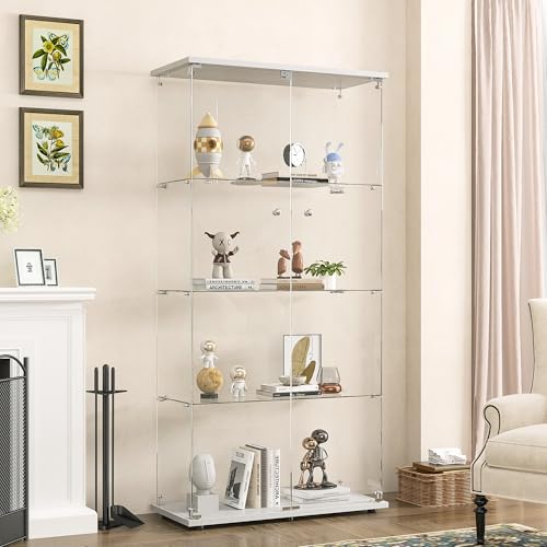 BPKADHY glasvitrinskåp, 4 lager glas trä vitrinskåp, 2 dörrar med lås glasvitrinskåp stående för vardagsrum sovrum kontor vit stående hylla av glas