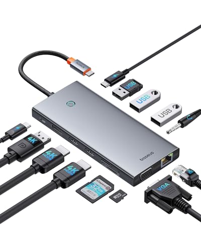 【Chip-optimerad】Baseus USB C dockningsstation 3-bildskärmar, 13-i-1 USB C-hub med 2 HDMI 4K@60 Hz, DisplayPort 4K@60 Hz, VGA, USB 3.1 10 Gbps, PD 100 W och Ethernet för Dell/HP/Lenovo/Surface Laptop