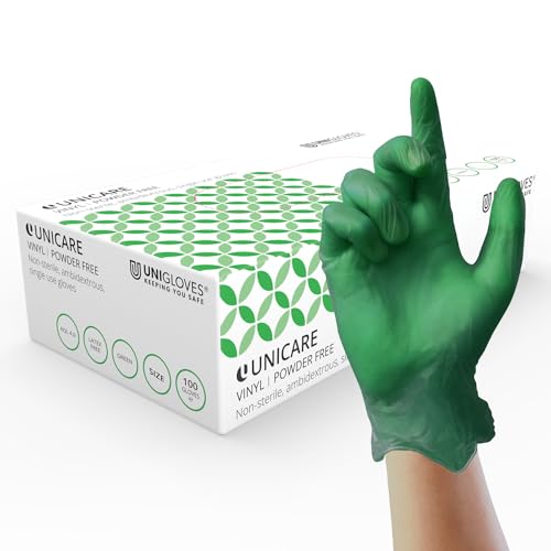 UNIGLOVES Unicare Vinyl Disposable Gloves – mångsidiga undersökningshandskar, puderfria och latexfria – låda med 100 st, grön, XL (GS0125)